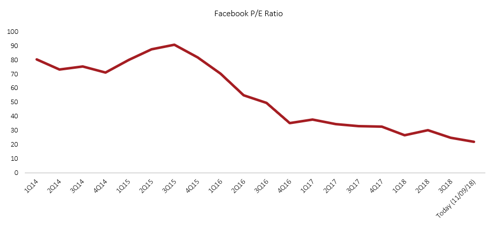 Now, it’s obvious that Facebook in 2018 is quite different from what the company it was back in 2013, when its stock started its mind-blowing ascent (close to 10 times returns in 5 years, from July 2013 to July 2018). Many of the concerns surrounding Facebook’s potential to continue to grow are justified, and require addressing. And yet, at 22x P/E, Facebook appears to be much cheaper than most of the other big tech companies: for instance, Google is currently traded at 42x P/E, Netflix at 108x, Microsoft at 45x, and Amazon at 96x (to be fair, P/E isn’t always a good benchmark to use to compare valuations, but in this case, the discrepancy between the Facebook’s valuation and that of others is too substantial to be ignored, even if the metric itself is flawed).